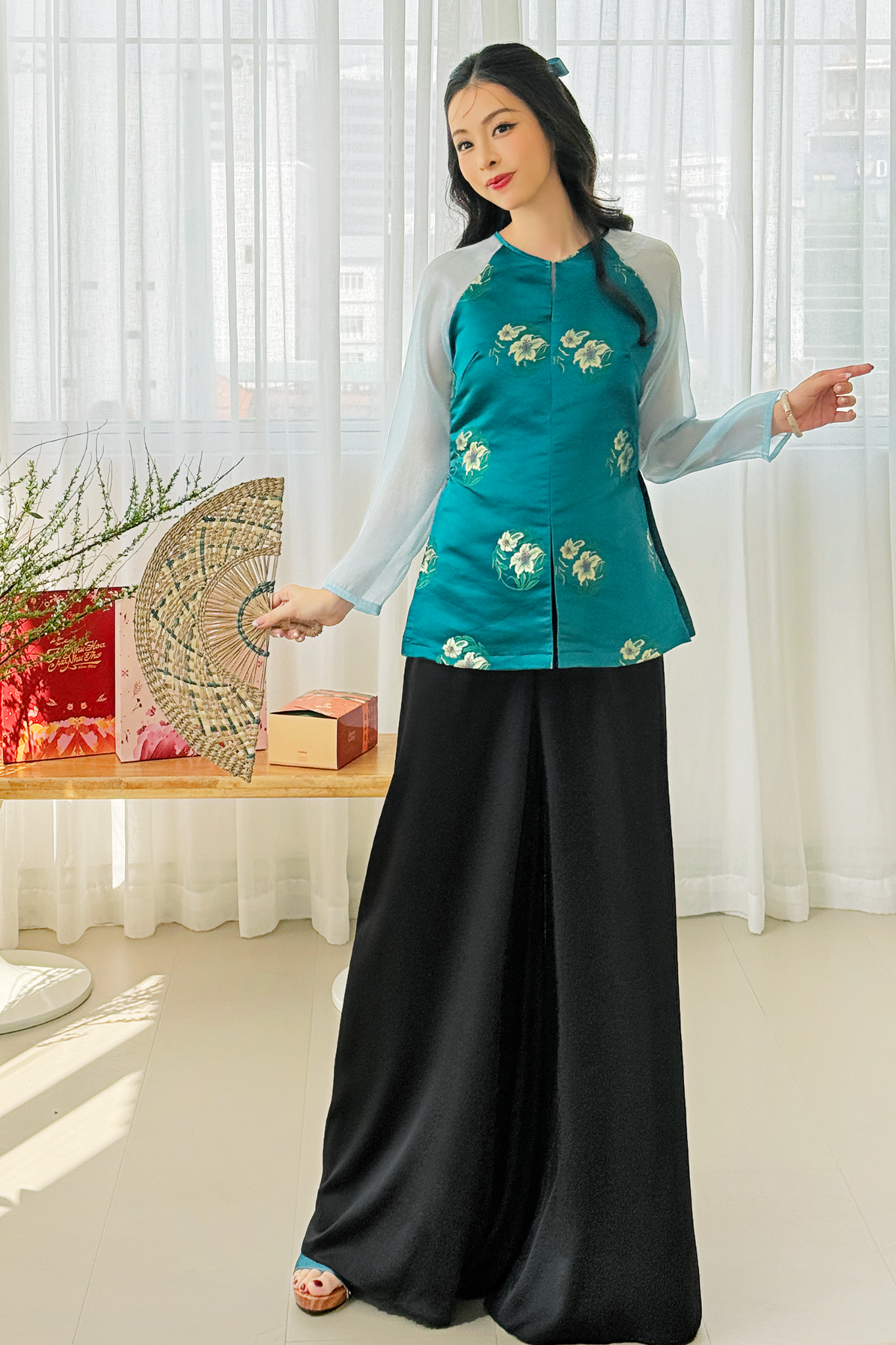 Chất liệu: Gấm dệt hoa ly, tay organza cao cấp.