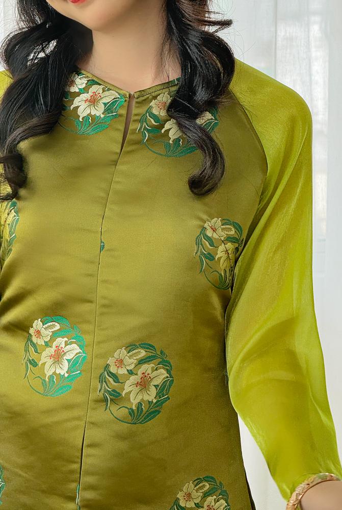 Chất liệu: Gấm dệt hoa ly, tay organza cao cấp.