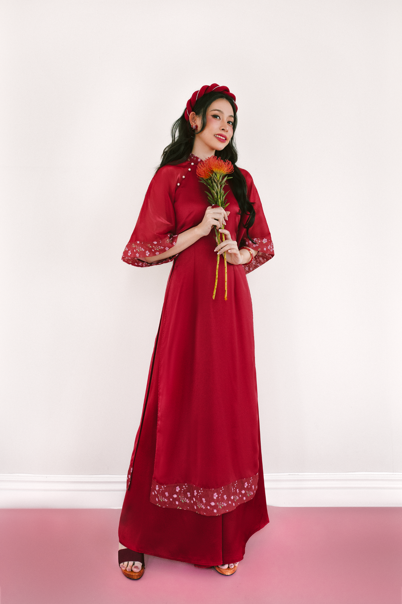 Chất liệu: Tằm nhung cao cấp, phối organza trơn và voan hoa.
