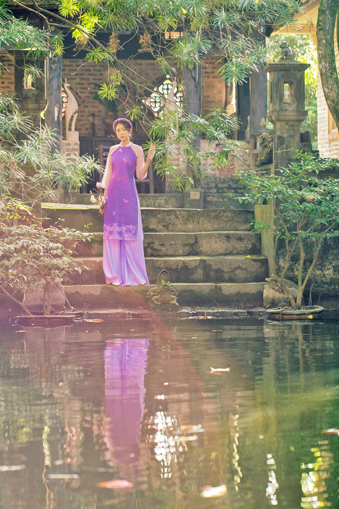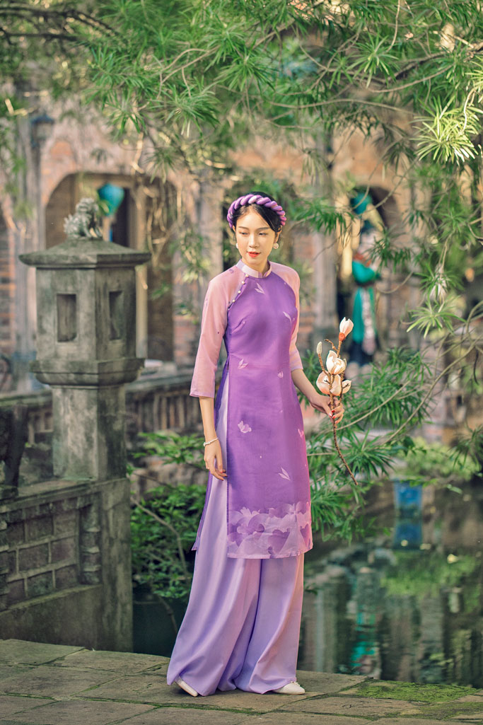 Tiếp tục ứng dụng hoa văn Diên Phúc - mẫu hoa văn được team Sumire thiết kế riêng từ hoa văn trên áo Nhật Bình thời Nguyễn, mang theo sức sống đương đại và đường nét giao hòa hơn. Trên loại chất liệu mới là tơ xô, chúng mình đã tạo nên Áo dài Dáng xưa Diên Phúc, với hoa văn ẩn hiện dịu dàng, cùng Quần ống rộng tha thướt và tao nhã.