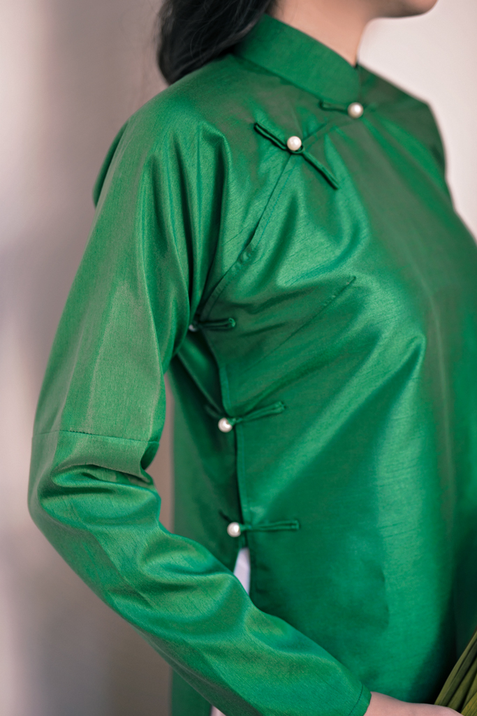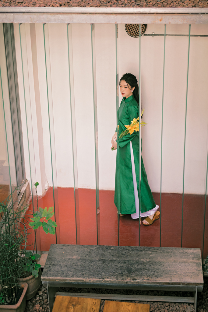 Áo dài Kiểu Xưa được chúng mình may dựa trên cảm hứng Áo ngũ thân thời xưa của người Việt Nam mình. Áo dáng suông thẳng, tà rộng hơn áo dài hiện đại, tuy không ôm eo bó dáng nhưng vẫn rất thanh thoát bay bổng bởi chúng mình đã chọn chất liệu gấm hoa mịn màng và nhẹ nhàng. Một chất liệu khác được đưa vào là Sa xước đứng dáng hơn và tạo độ sang trọng kiêu kỳ bởi sự óng ánh của thớ vải. Chúng mình làm dáng áo này cho chị/bạn không quá chú trọng vào việc tôn lên dáng người, mà muốn thả hồn người mặc nhiều hơn vào phong thái thanh lịch của người xưa, của những tấm hình hoài niệm.