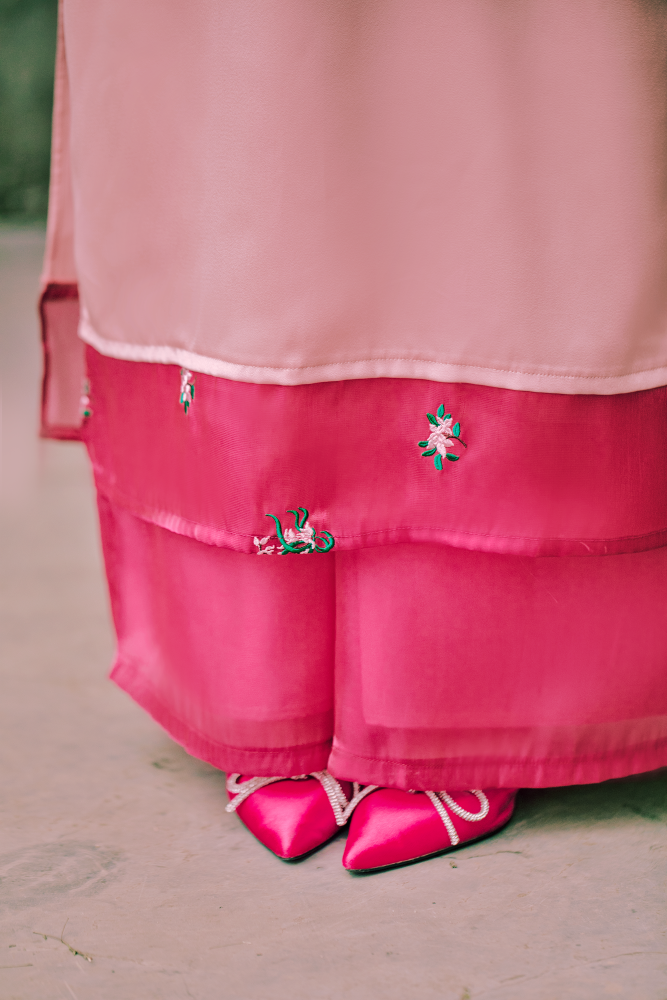 Chất liệu: Tằm nhung cao cấp, phối organza trơn và thêu hoa.