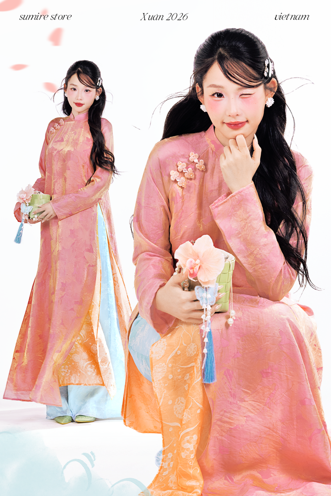 Áo dài cổ đứng dáng suôn, được may 02 lớp phối màu và đính chi tiết vải trang trí. Form dáng rộng rãi dễ mặc cho mọi dáng người.