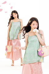 Thiết kế áo áo gồm 02 lớp, lớp ngoài tơ nhũ óng ánh, lớp lót lụa tổng hợp mềm mát, có hai dây rời tùy phối. Phối lên tới 5-6 kiểu mặc khác nhau, thuận tiện ứng dụng. Áo có độ bay rũ bồng bềnh, nhẹ nhàng.