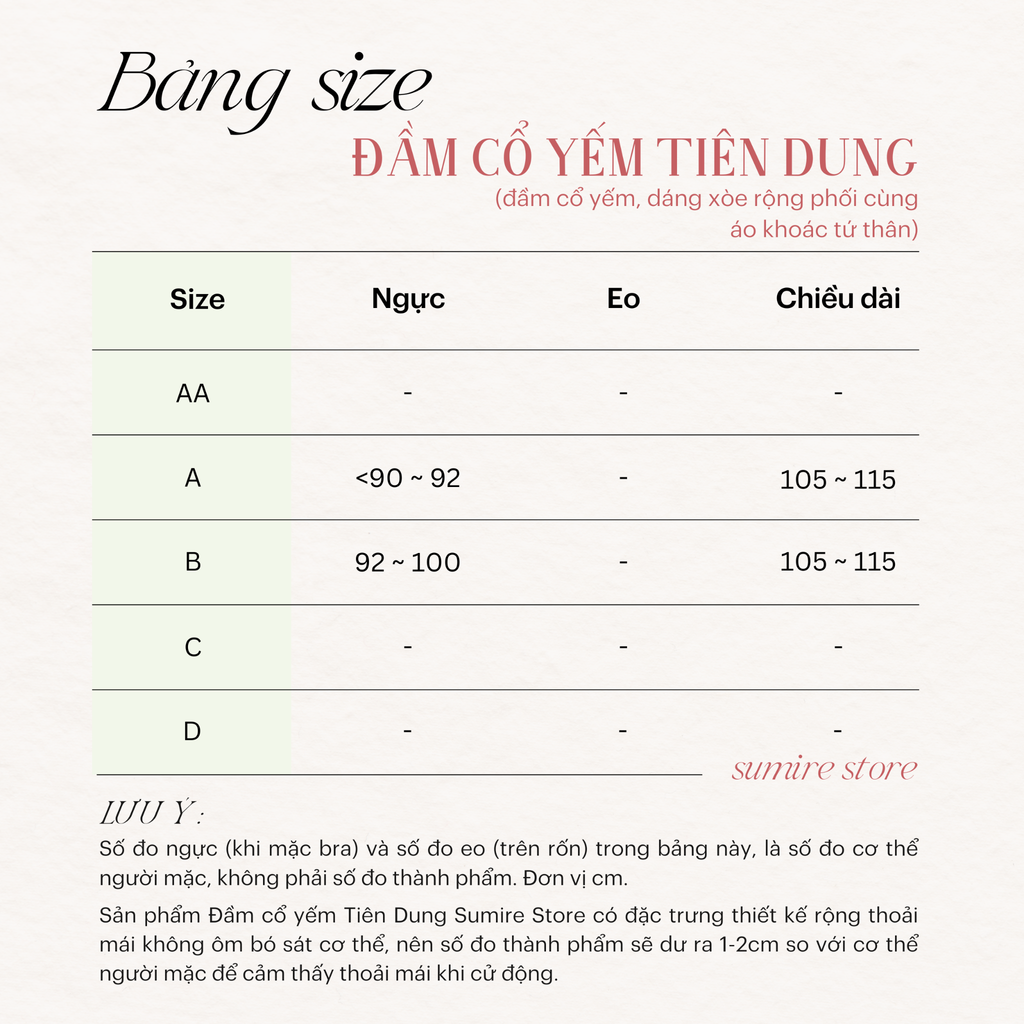 Đầm cổ yếm Tiên Dung: thiết kế yếm có phần lưng dễ mặc, đính kèm 01 sợi dây rời để cột eo hoặc cột thành nơ như phụ kiện. Đầm có độ xòe rộng, không có xẻ tà nhưng vẫn dễ dàng di chuyển, thoải mái vận động. Lớp lót toàn đầm.