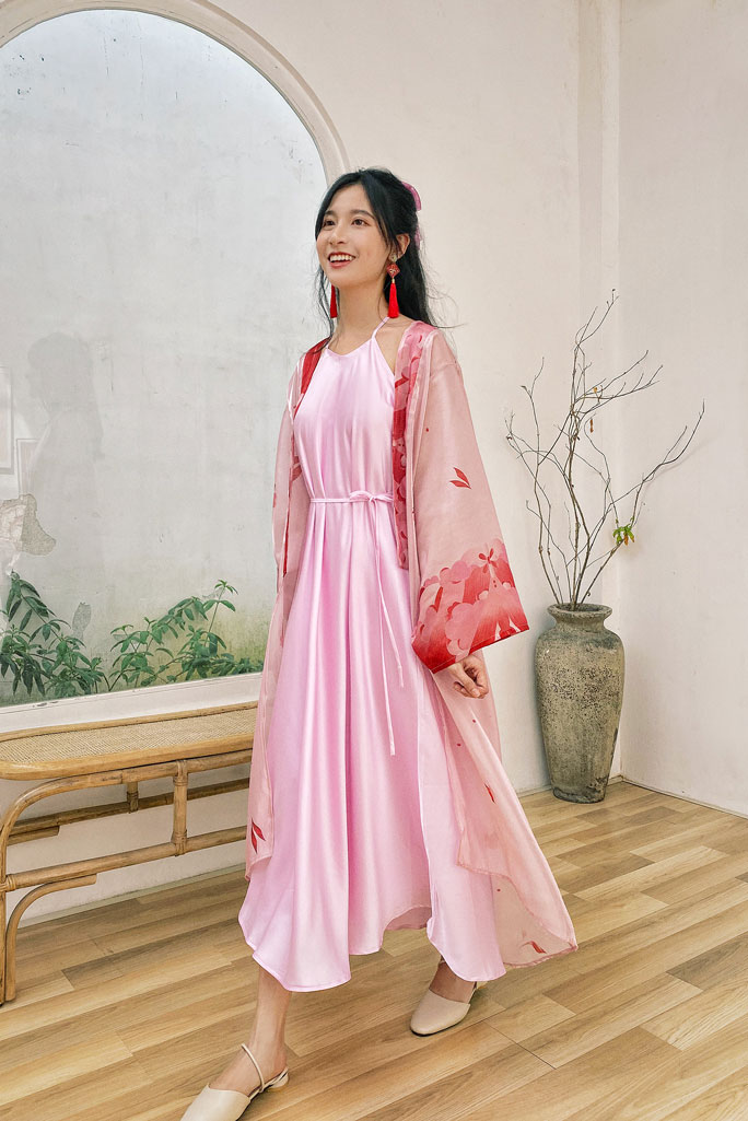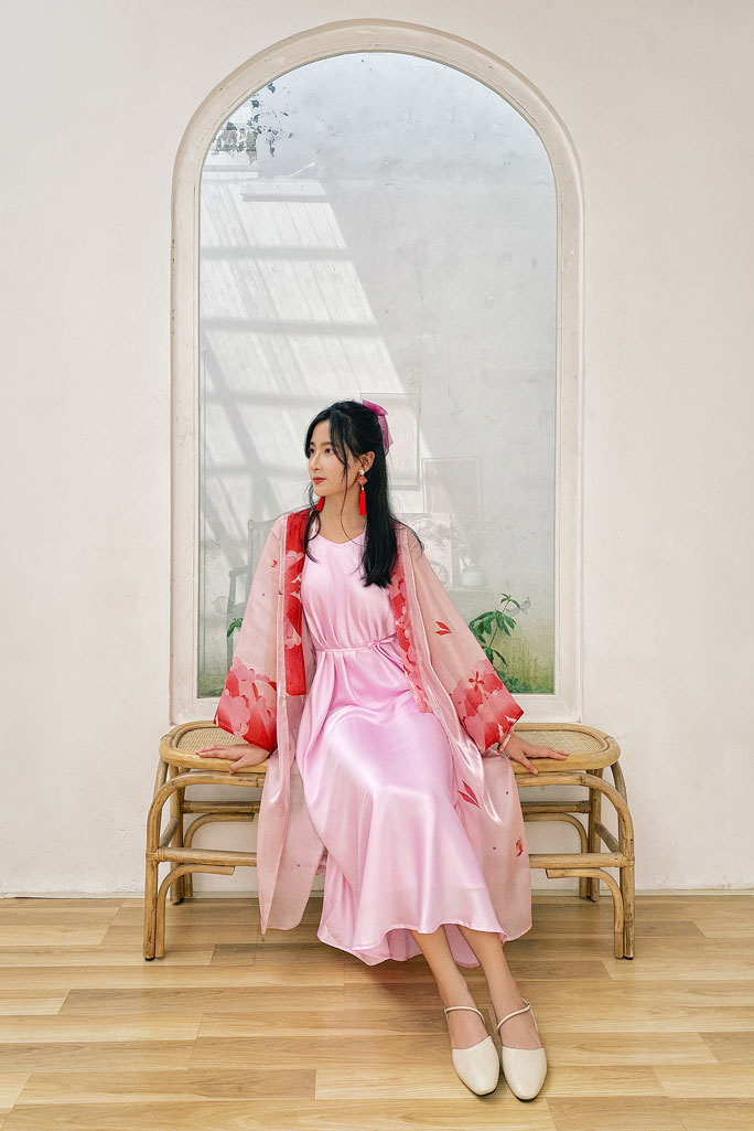Cơn mưa đầu xuân tưới tắm cho hoa lá nảy lộc đâm chồi. Giữa những bồng bềnh và tung tăng của thiên nhiên, chiếc đầm cổ yếm satin 2 lớp, bung xòe như điệu múa nhỏ xinh xắn và rực rỡ. Đi cùng là áo khoác chất liệu organza cao cấp được in hoa văn cách điệu từ hoa trên áo Nhật Bình thời Nguyễn, chỉ có tại Sumire Store.