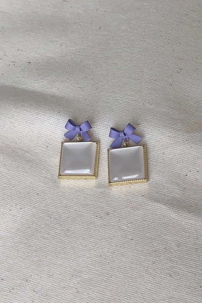 - Màu sắc: tím và trắng, nơ tím đá vuông trắng.