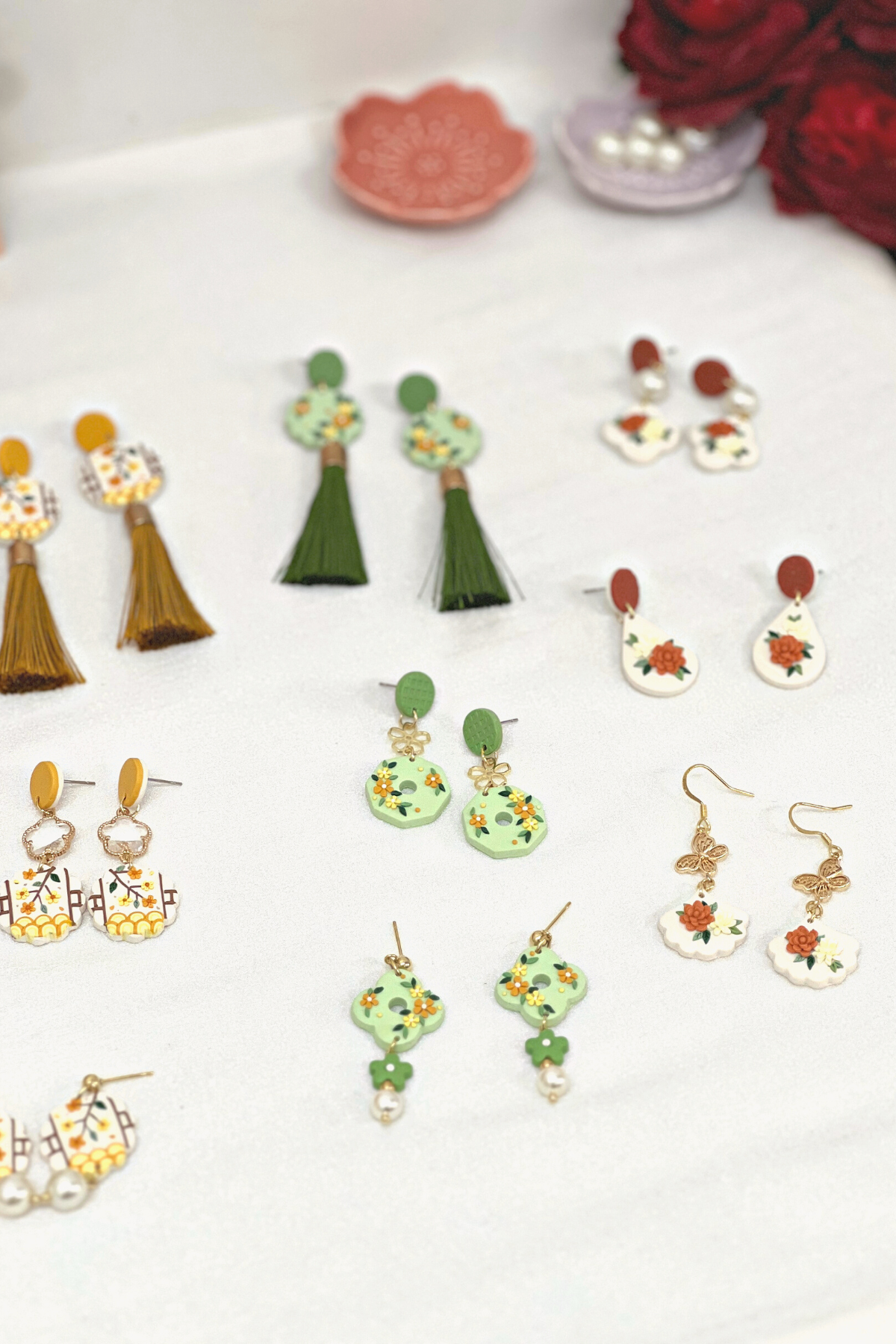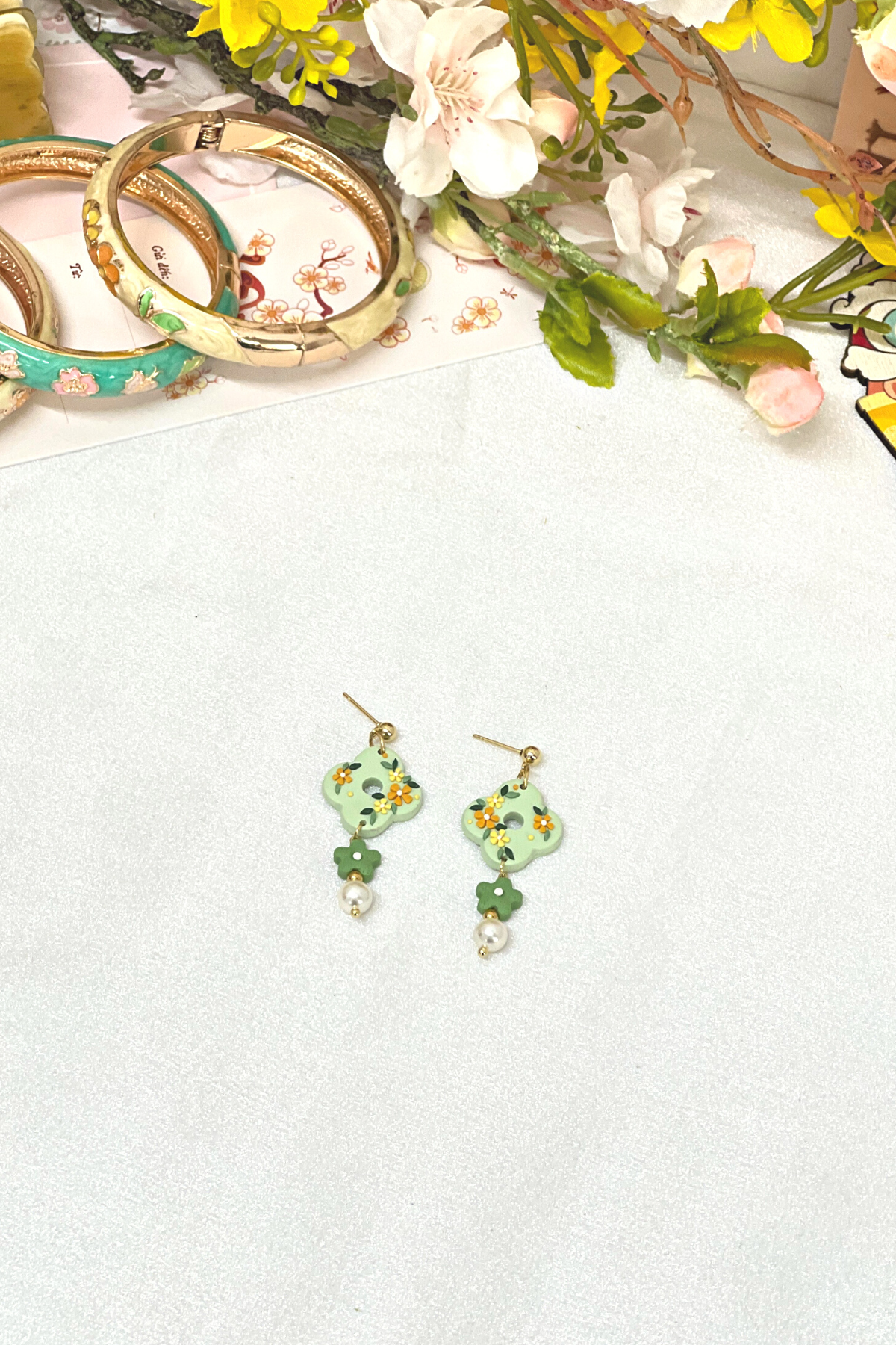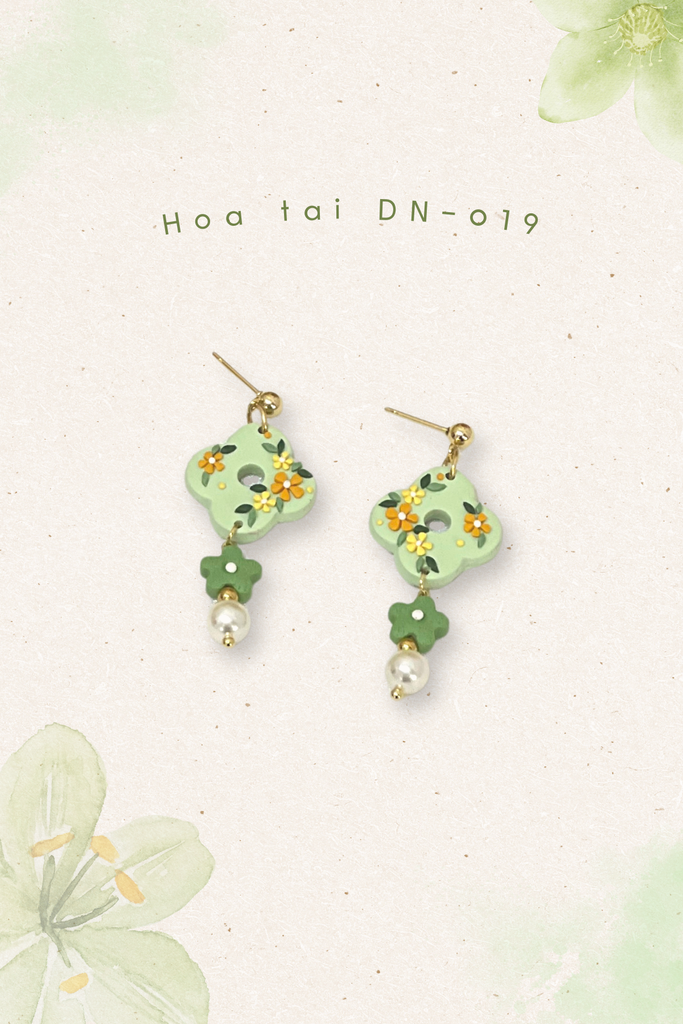 - Sản phẩm: Hoa tai DN-019 Đất Nung Lạc Hoa Bính xanh cốm phối hoa 5 cánh hạt ngọc