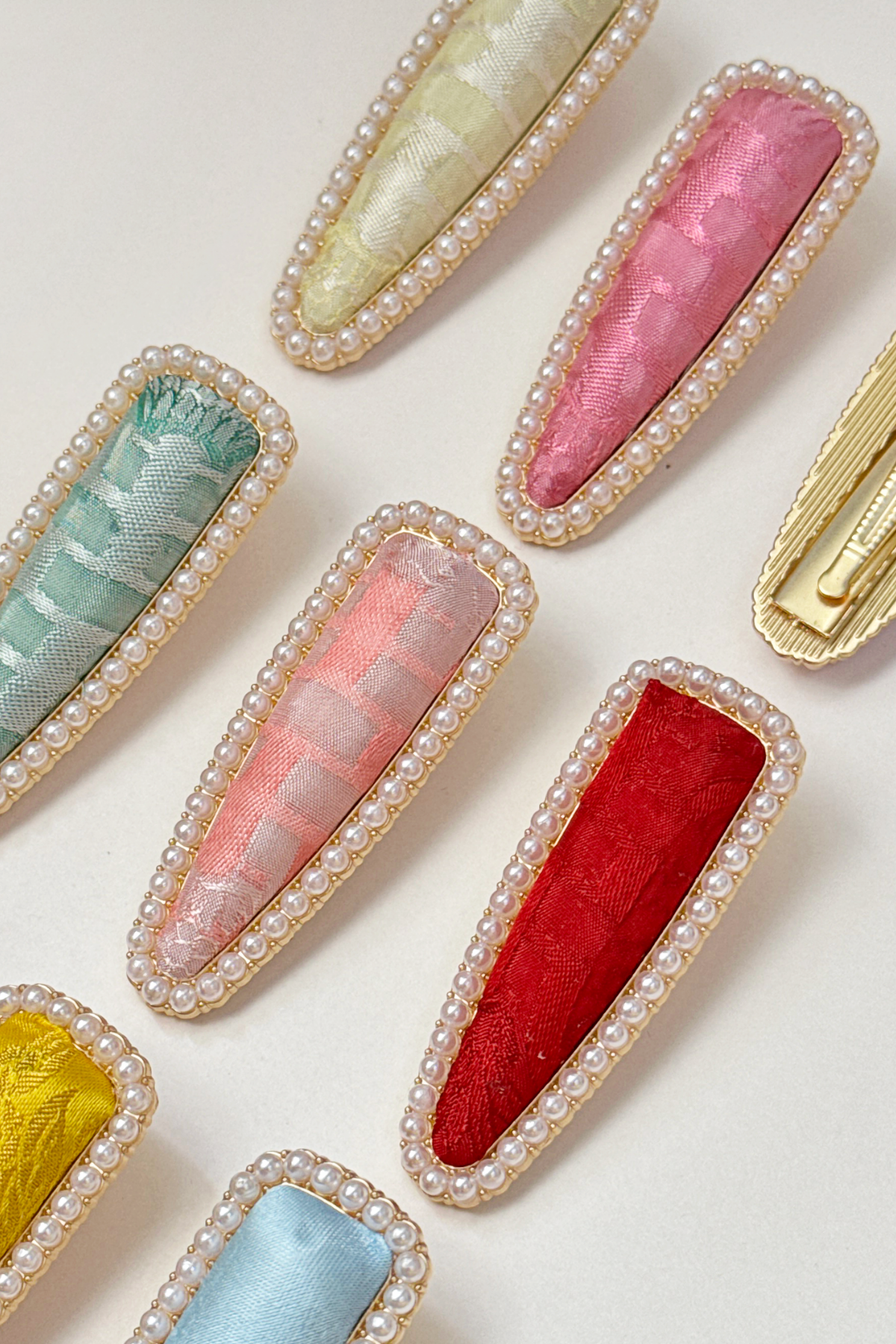 Kẹp tóc bọc lụa tơ tằm Gấm Tiên - Cánh hoa viền hạt ngọc