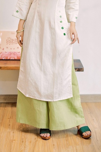 Chiếc quần Trúc Chi có form dáng ống rộng phù hợp cho mọi dáng chân, chất liệu linen nên vải tạo độ đứng dáng rất tự nhiên và đằm mình.