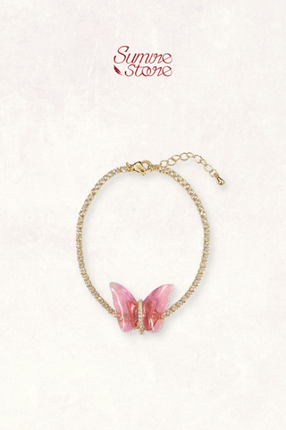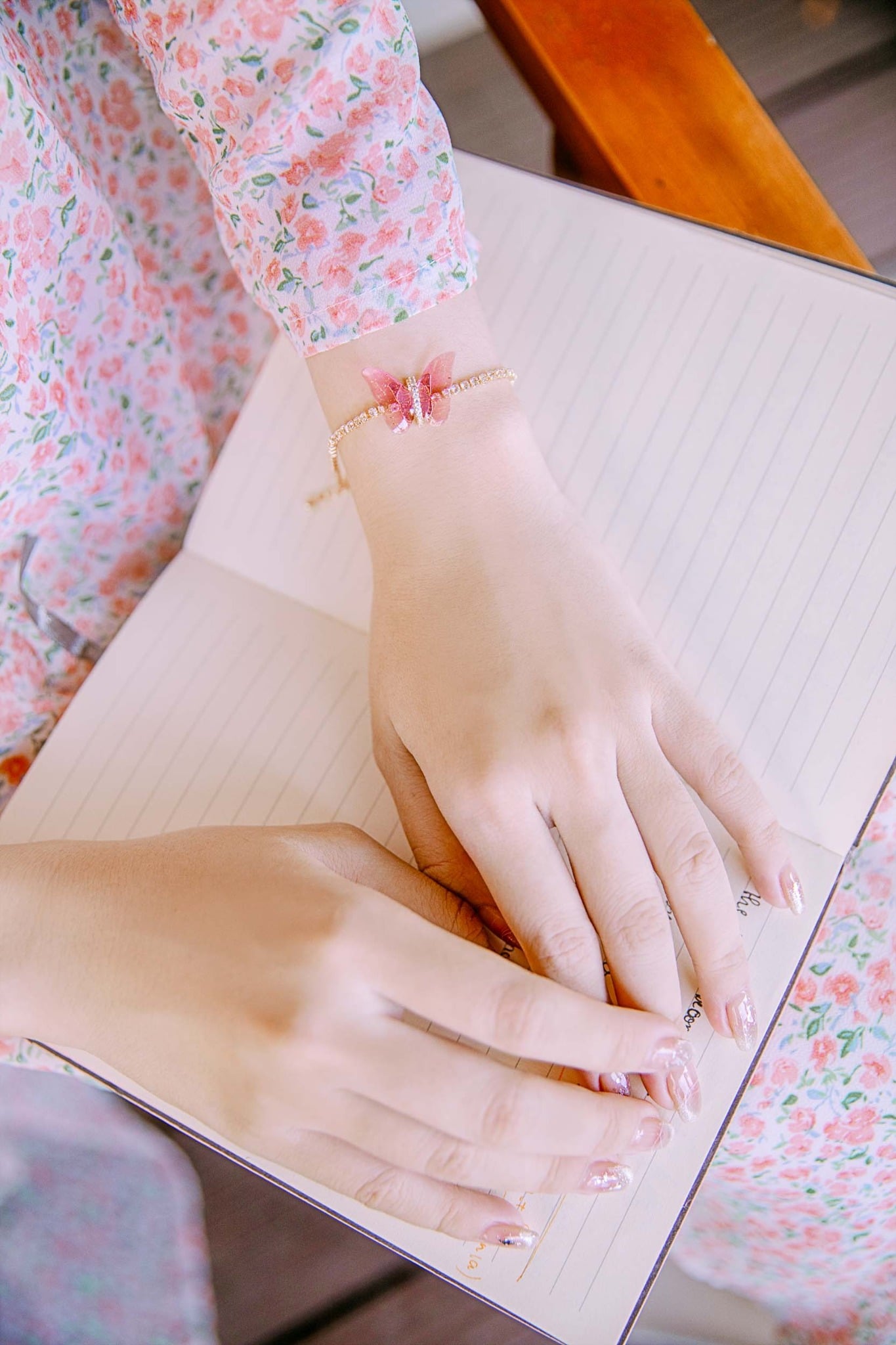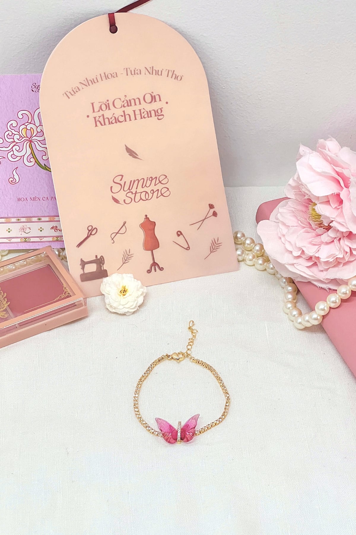 - Màu sắc: Màu vàng và hồng, vòng tay đính đá bướm hồng.